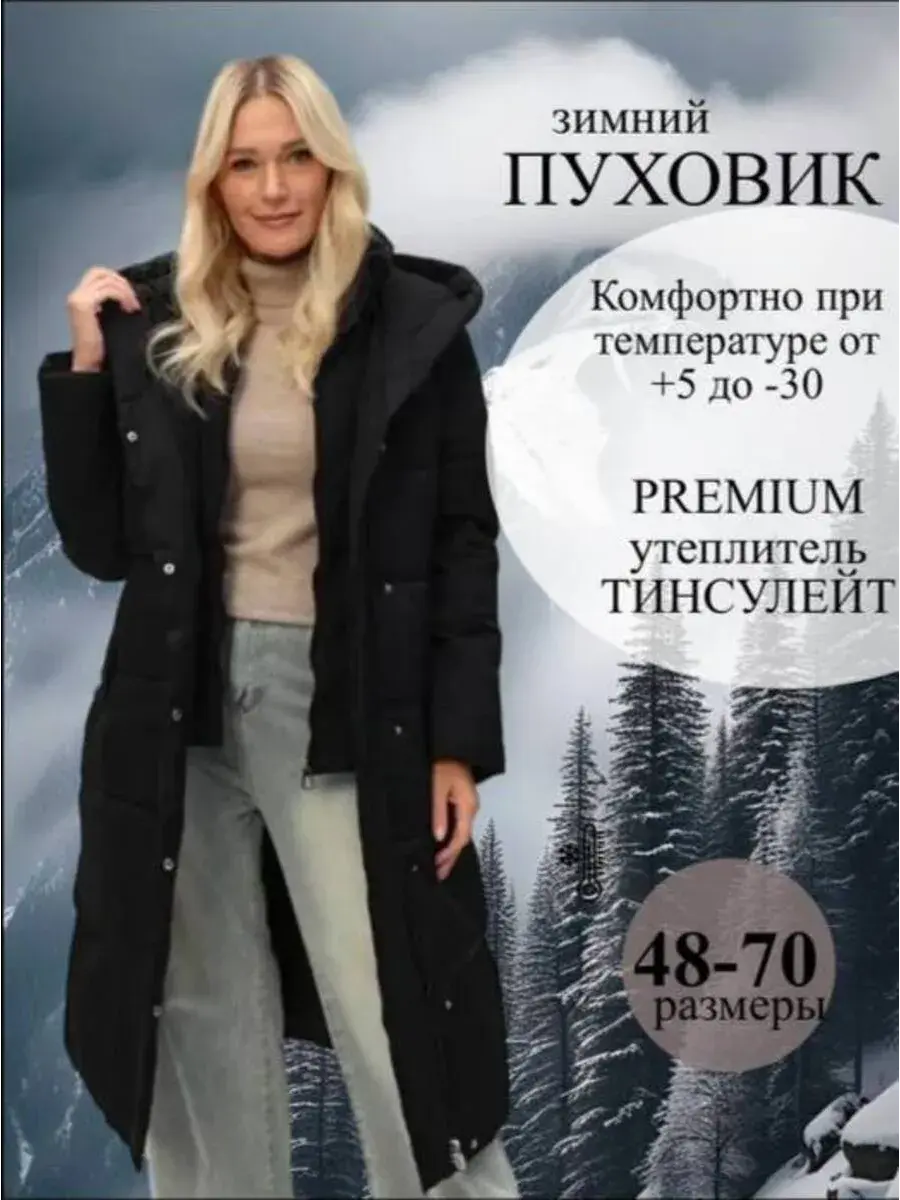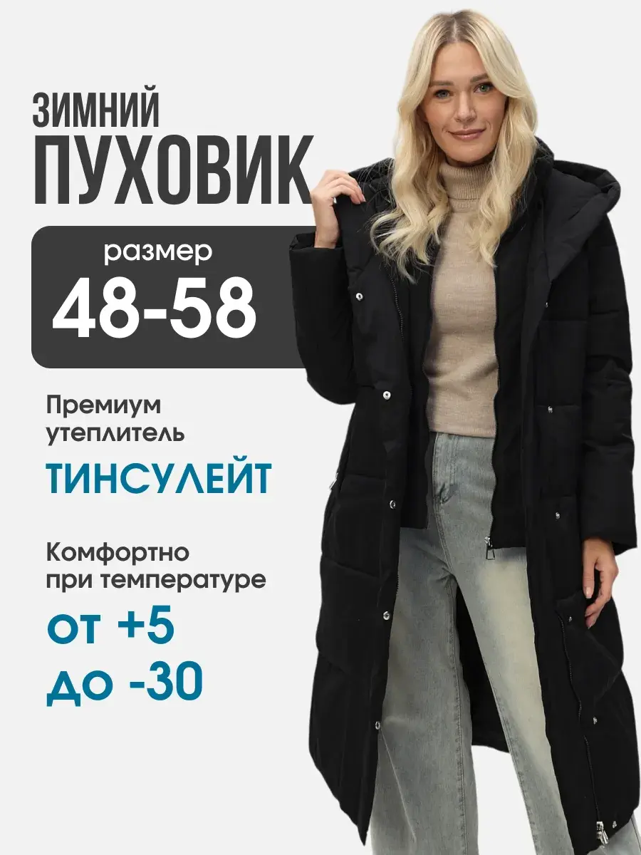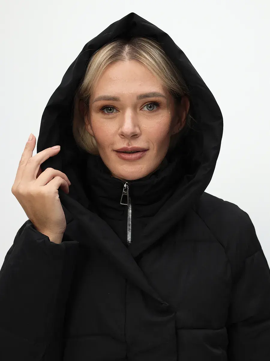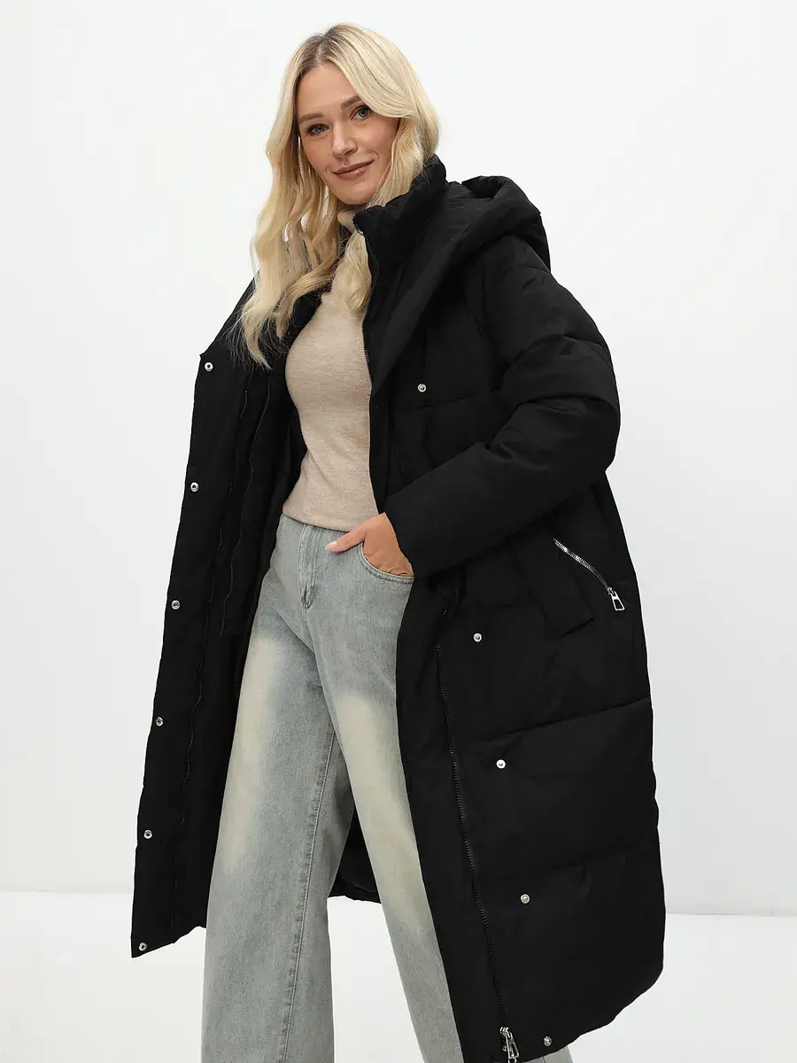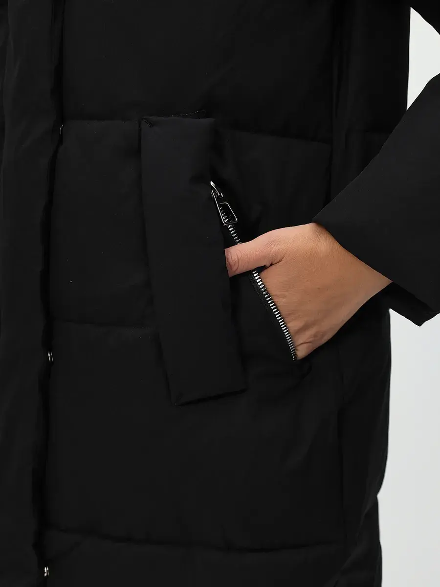 Пуховик женский зимний длинный с капюшоном в универсальном чёрном цвете — тёплая и стильная модель сезона 2025-2026, созданная для морозной зимы и холодной погоды. Этот удлинённый зимний пуховик без стёжки, выполнен в лаконичном дизайне, который легко сочетается с любой одеждой — от спортивной до классической.