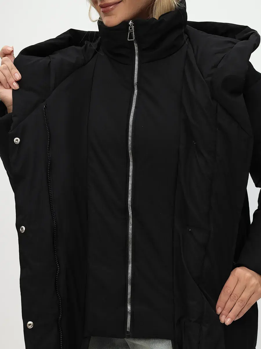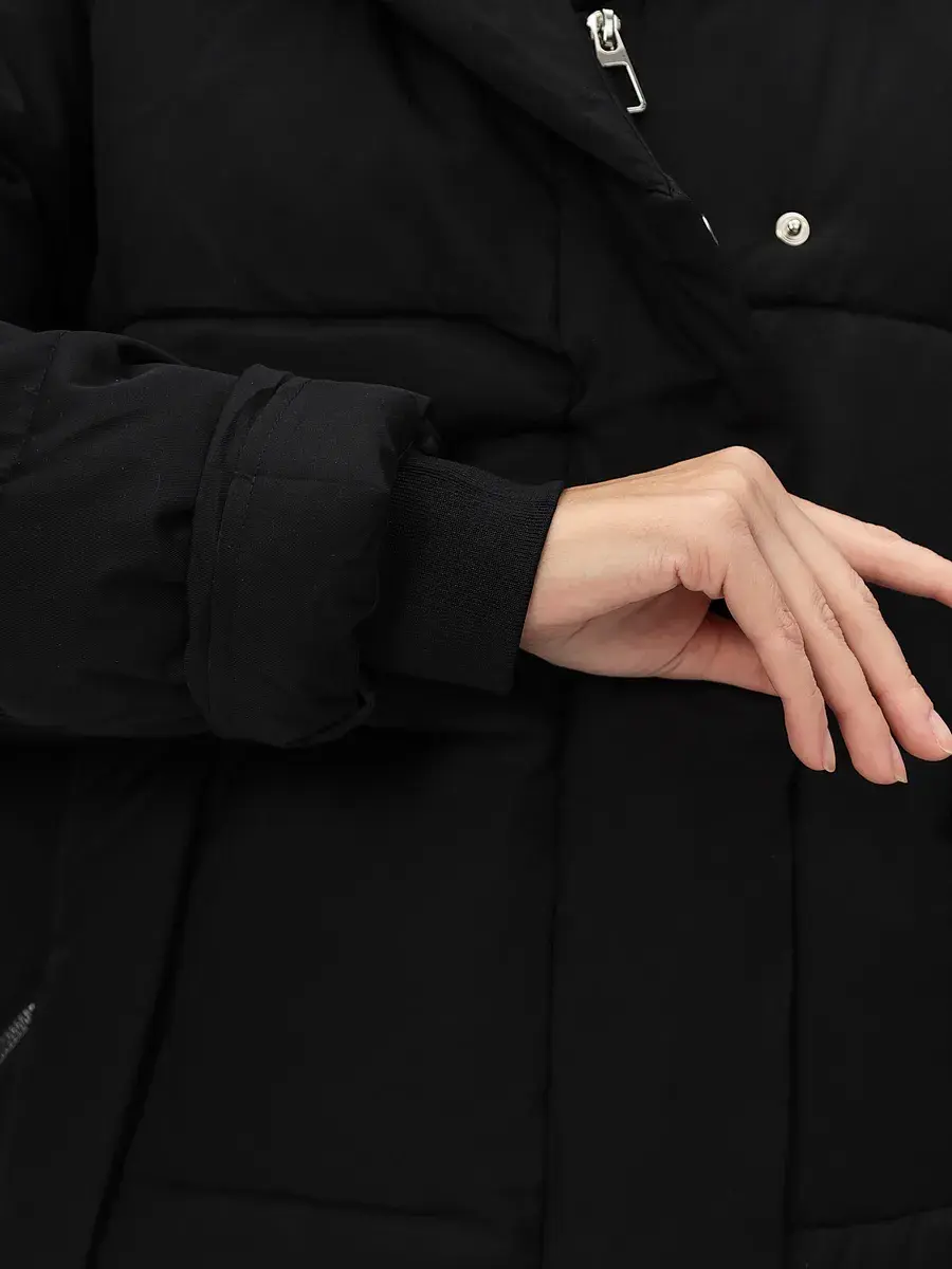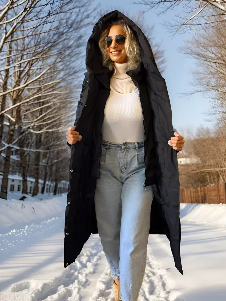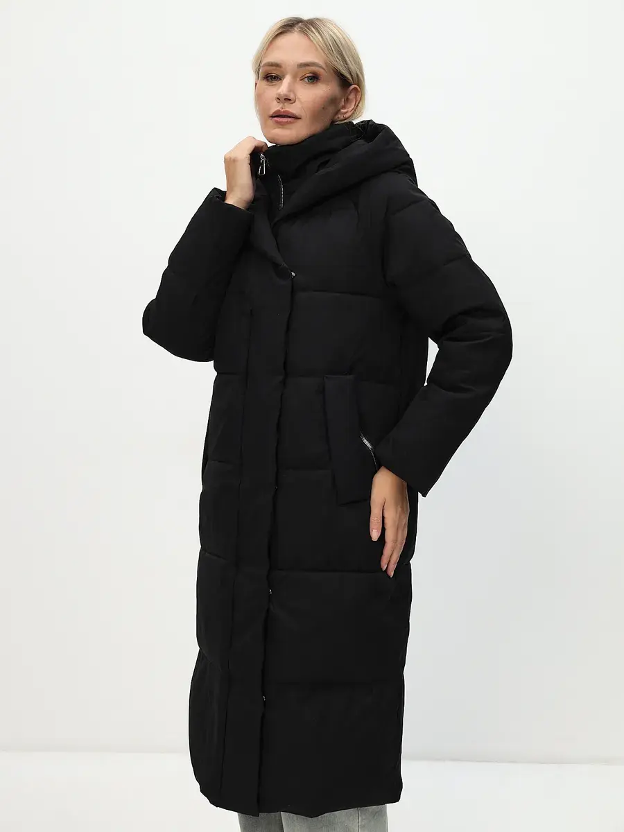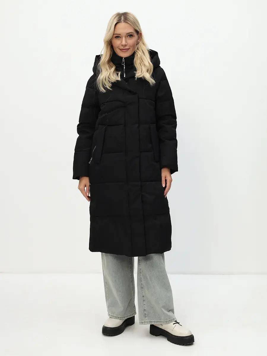 Пуховик женский зимний длинный с капюшоном в универсальном чёрном цвете — тёплая и стильная модель сезона 2025-2026, созданная для морозной зимы и холодной погоды. Этот удлинённый зимний пуховик без стёжки, выполнен в лаконичном дизайне, который легко сочетается с любой одеждой — от спортивной до классической.