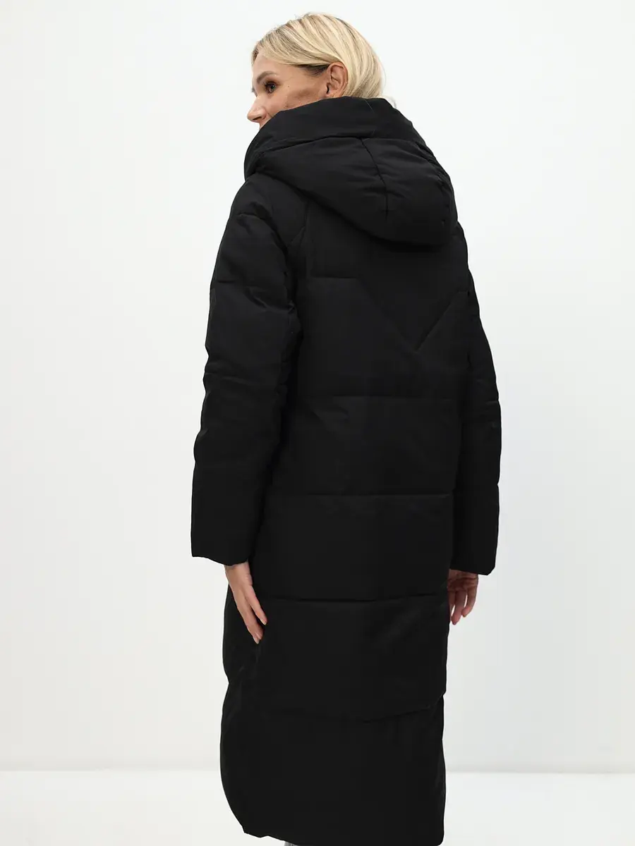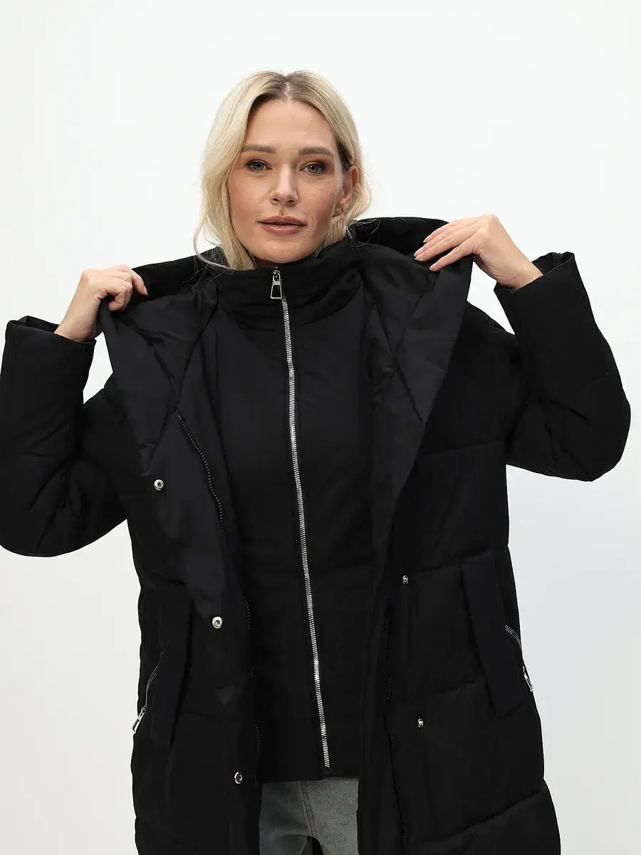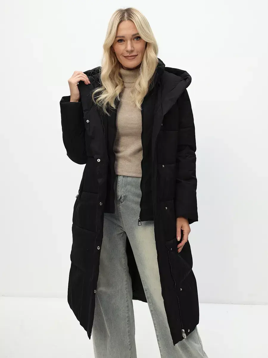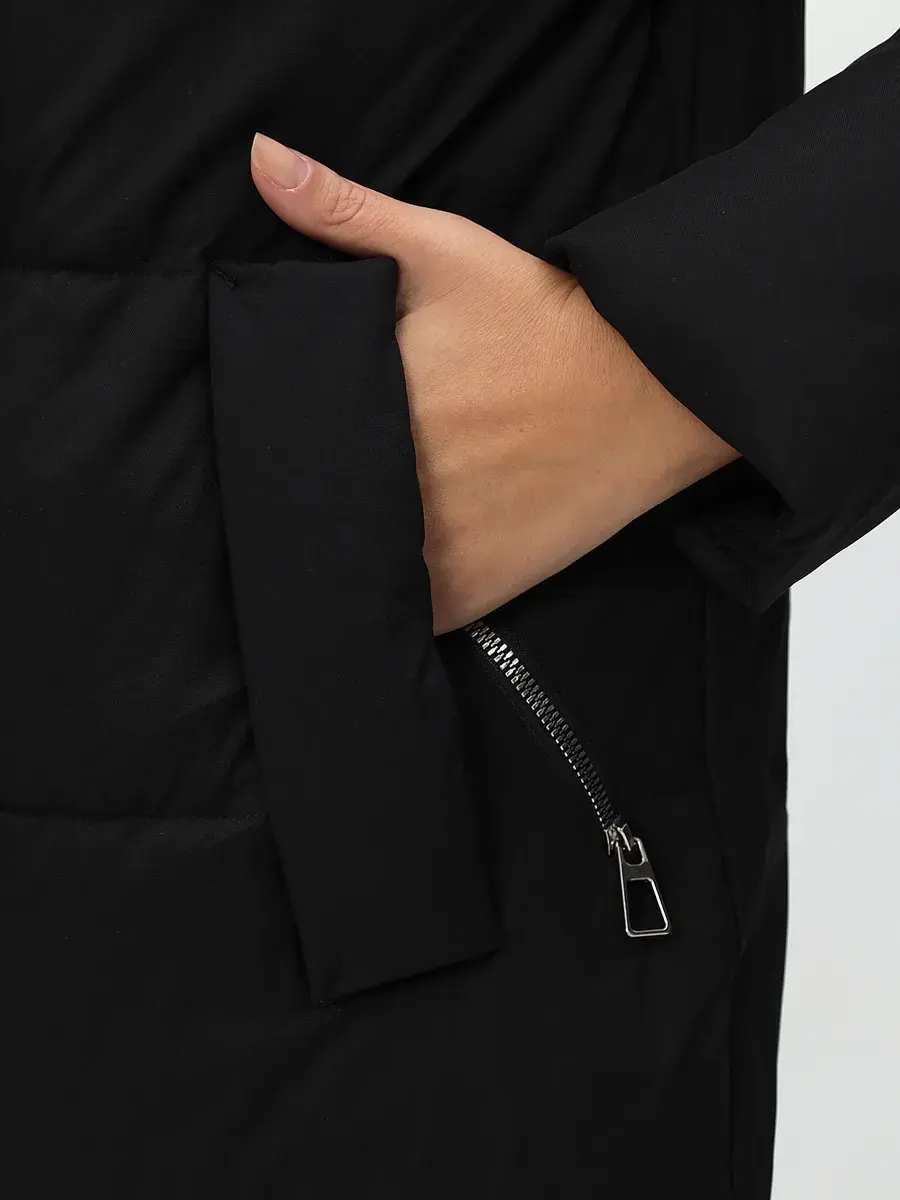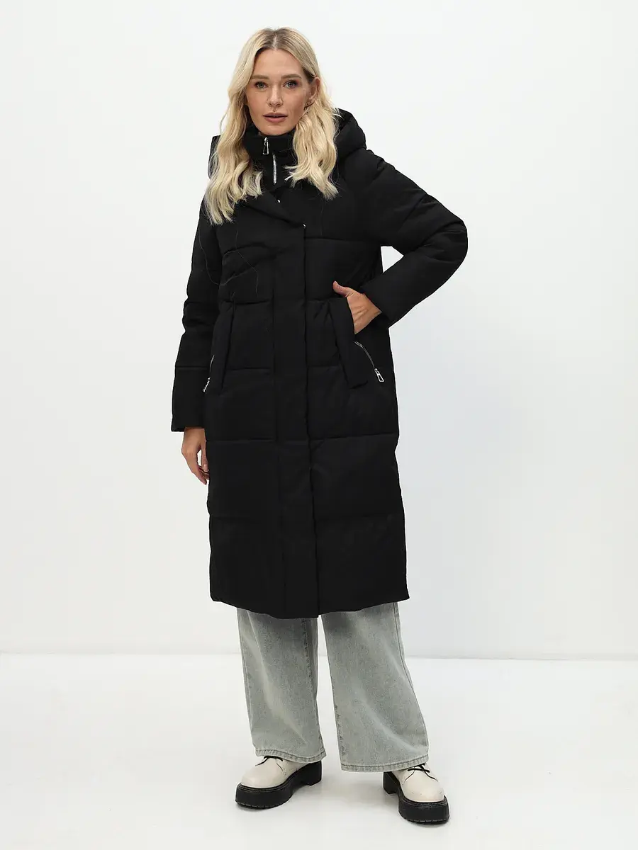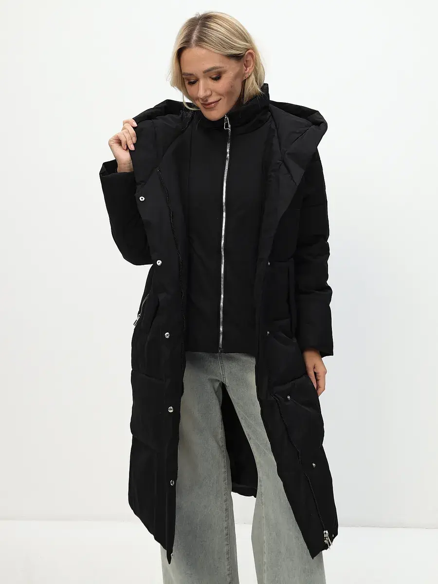 Пуховик женский зимний длинный с капюшоном в универсальном чёрном цвете — тёплая и стильная модель сезона 2025-2026, созданная для морозной зимы и холодной погоды. Этот удлинённый зимний пуховик без стёжки, выполнен в лаконичном дизайне, который легко сочетается с любой одеждой — от спортивной до классической.