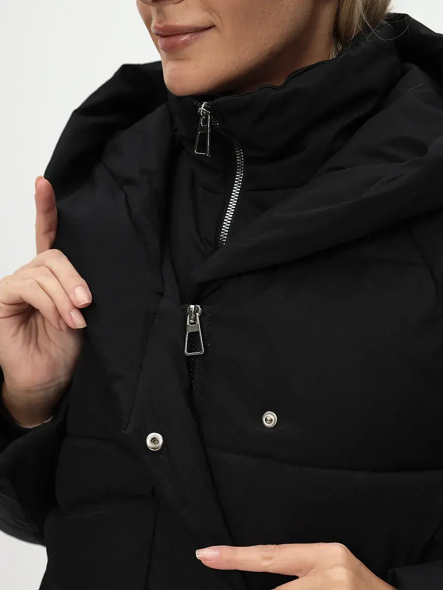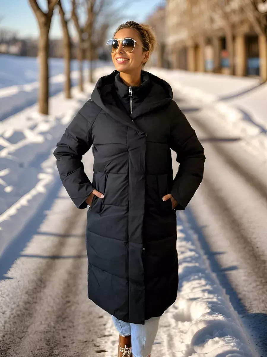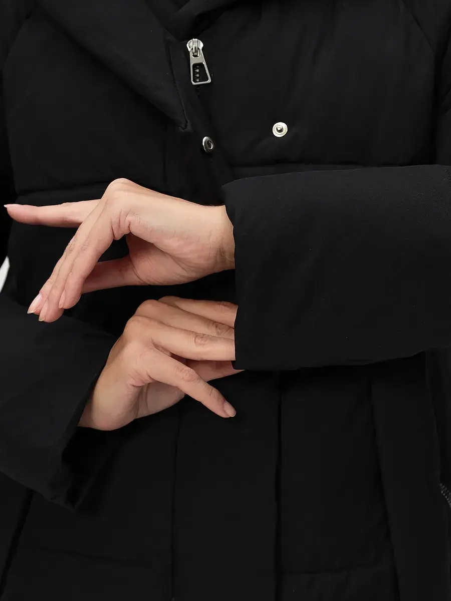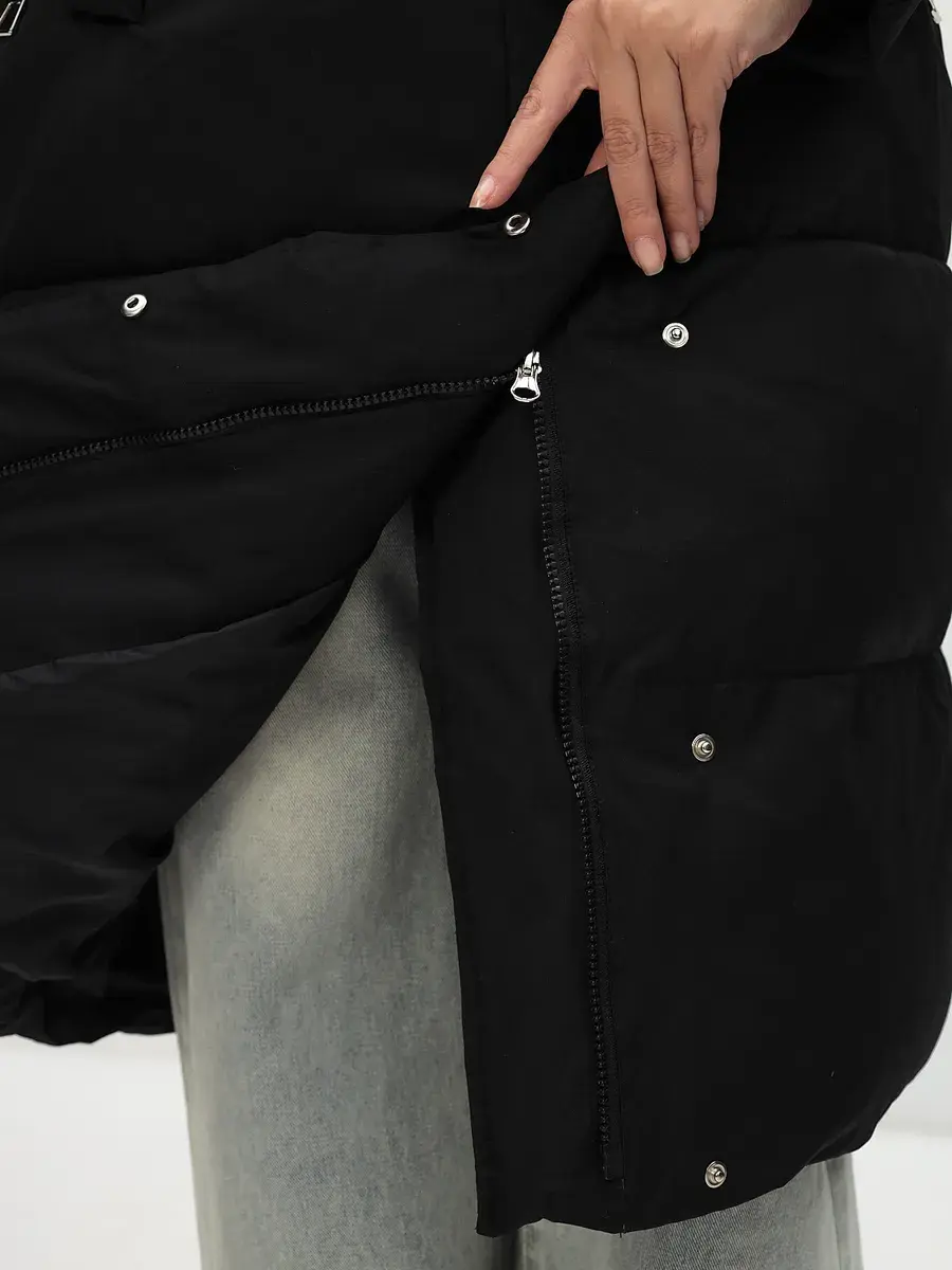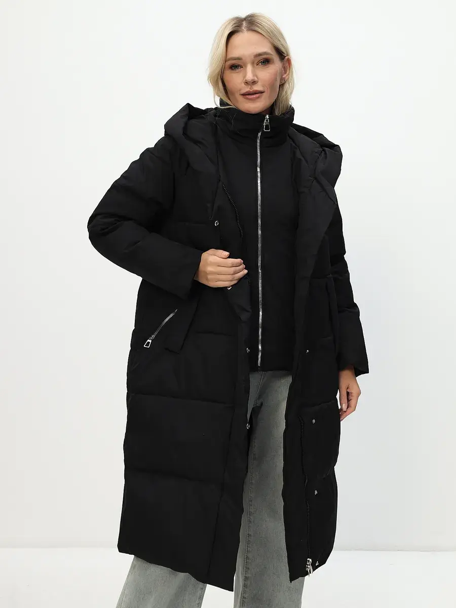 Пуховик женский зимний длинный с капюшоном в универсальном чёрном цвете — тёплая и стильная модель сезона 2025-2026, созданная для морозной зимы и холодной погоды. Этот удлинённый зимний пуховик без стёжки, выполнен в лаконичном дизайне, который легко сочетается с любой одеждой — от спортивной до классической.